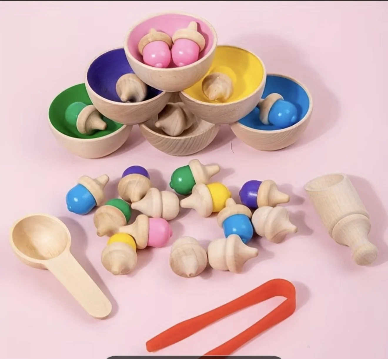 Little learners will love sorting colorful acorns into their matching bowls, building essential skills while staying engaged in calm, focused play. Each piece is thoughtfully designed to support color recognition, fine motor development, and early problem-solving—all in a fun and natural way.