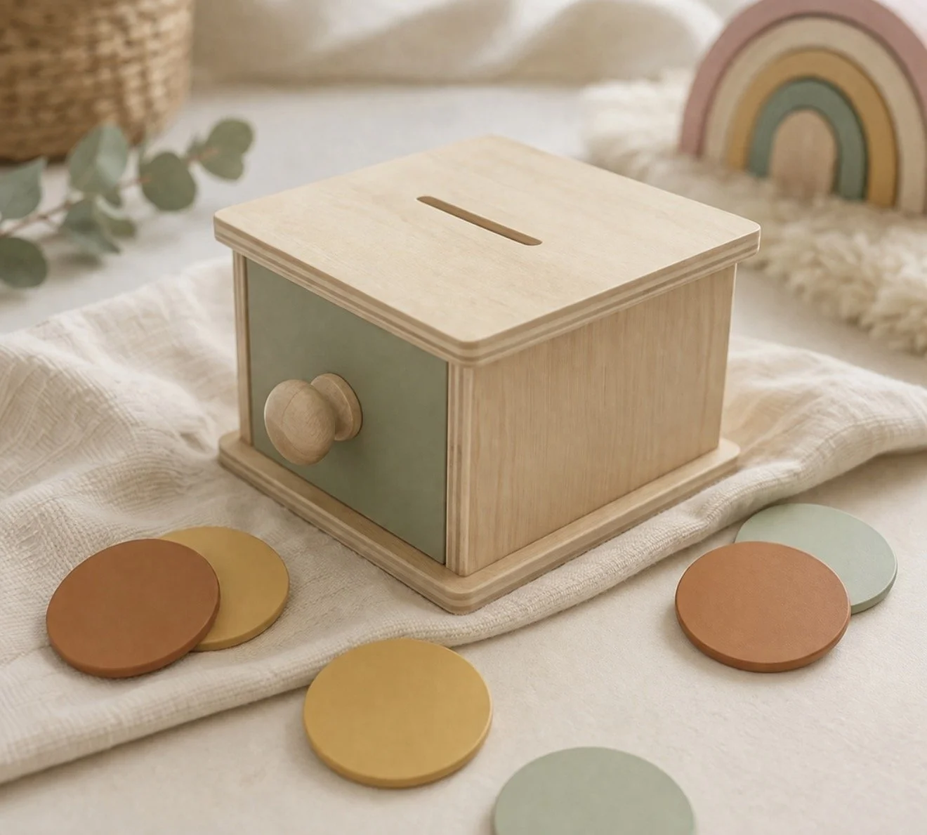 With its clean design, soft natural tones, and smooth wooden finish, the Brainy Coin Box encourages calm, intentional play while fitting seamlessly into your home.